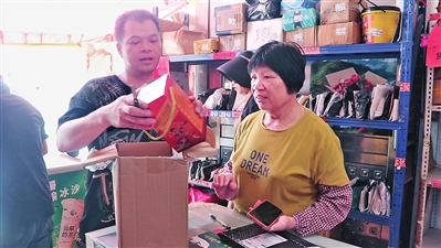 港北区大圩镇中国邮政综合便民服务站何村店内,黄福强正在给村民取快递包裹。